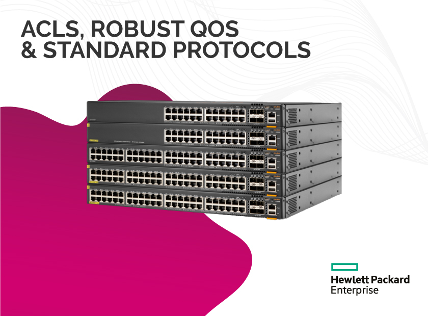 For 5400R VSF stacks, this series provides scalable aggregation with Virtual Switching Framework (VSF) stacking technology, hitless failover, and fast software upgrades. Open Shortest Path First (OSPF), IPv6, IPv4 Border Gateway Protocol (BGP), tunneled node, robust Quality of Service (QoS), and Policy-Based Routing are among the advanced layer 2 and 3 features that require no software licensing.