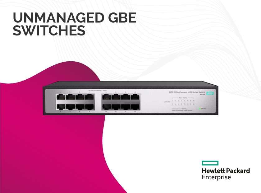 The HPE 1820 Switch Series is a collection of six smart-managed, fixed-configuration Gigabit Ethernet Layer 2 switches that include 8-, 24-, and 48-port Gigabit Ethernet switches as well as 8-, 24-, and 48-port Gigabit PoE+ models, all of which provide non-blocking Gigabit per port performance. For environments where line power is unavailable, the 8-port Gigabit Ethernet model can be operated by an upstream Power over Ethernet (PoE) switch.